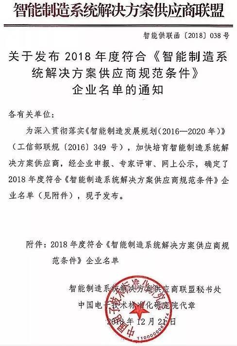 為加強(qiáng)智能制造系統(tǒng)解決方案供應(yīng)商管理,深入貫徹落實(shí)《智能制造發(fā)展規(guī)劃(2016—2020年)》(工信部聯(lián)規(guī)〔2016〕349號(hào)),中國(guó)智能制造系統(tǒng)解決方案供應(yīng)商聯(lián)盟組織開(kāi)展符合《智能制造系統(tǒng)解決方案供應(yīng)商規(guī)范條件》的企業(yè)申報(bào)工作,經(jīng)專(zhuān)業(yè)評(píng)審、網(wǎng)上公示,最終全國(guó)范圍共評(píng)選出82家知名企業(yè),山東省共8家企業(yè)入選。