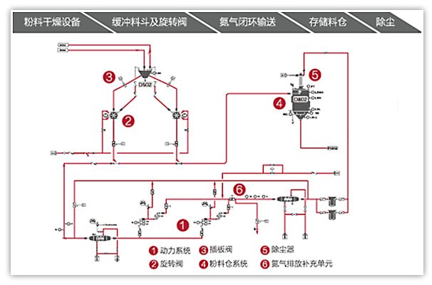 氮?dú)忾]環(huán)輸送,粉料處于密閉微正壓狀態(tài),防爆等級(jí)DIP A22 T4+EXDII BT4;