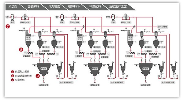 用于塑料改性的多個(gè)生產(chǎn)過程(包括主料、添加劑)的自動(dòng)輸送與配料系統(tǒng)。整個(gè)過程清潔環(huán)保,粉體處于密閉輸送狀態(tài),與外界隔絕,具體流程可按客戶具體生產(chǎn)要求制定。
